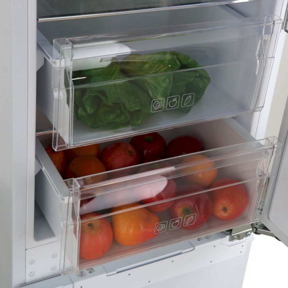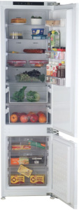 Встраиваемый холодильник Haier HRF305NFRU с лаконичным белым дизайном обладает общим полезным объемом 286 л. В обеих камерах есть система автоматической разморозки No Frost, что упрощает уход за оборудованием. Дисплей отображает температуру и активные программы, звуковой сигнал срабатывает при открытии двери.